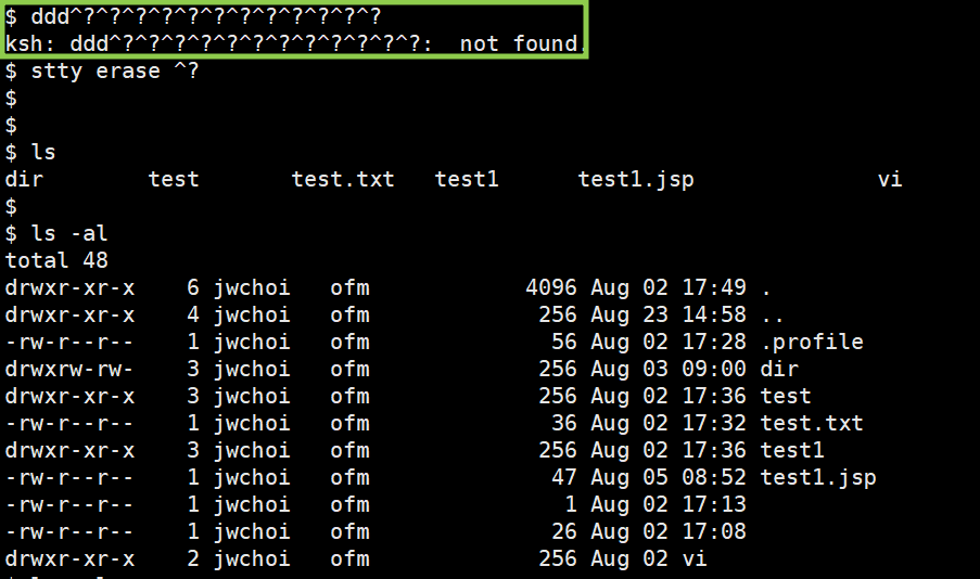 보통의 리눅스 서버에서는 백스페이스를 누르면 지워진다.