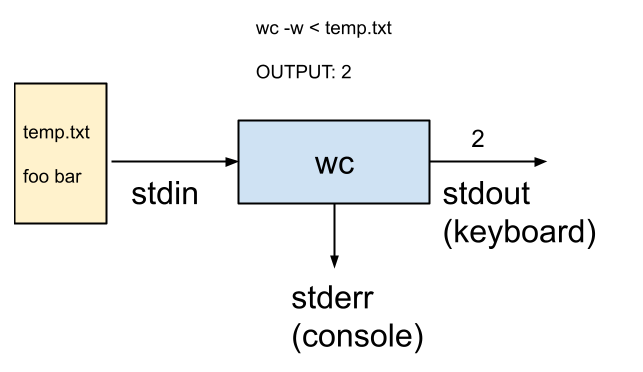 기본적으로 temp.txt를 wc의 stdin으로 만들면서 temp.txt로 부터의 wc를 가져온다.