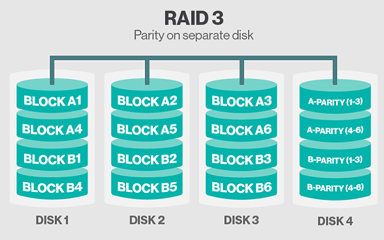 - 최소 3개 이상의 디스크로 구성하며 데이터가 바이트 단위로 저장되고 별도의 전용 디스크에 Parity 정보를 저장