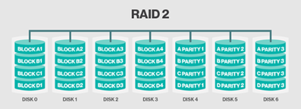 - 하나의 디스크 장애 시 Hamming code 기술을 사용하여 디스크 하나를 복구 가능