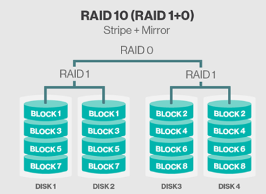 - RAID 0 방식으로 데이터를 저장하고, RAID 1 방식으로 디스크를 복제