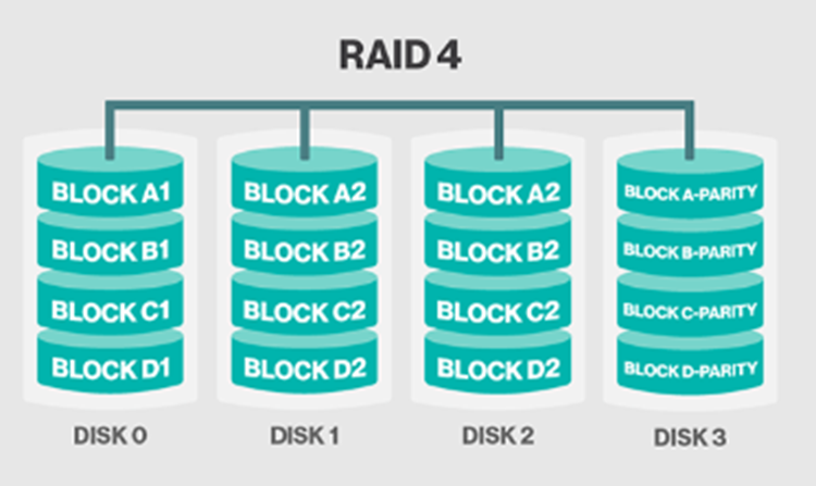 - 최소 3개 이상의 디스크로 구성하며 데이터가 Block 단위로 저장되고 별도의 전용 디스크에 Parity 정보를 저장