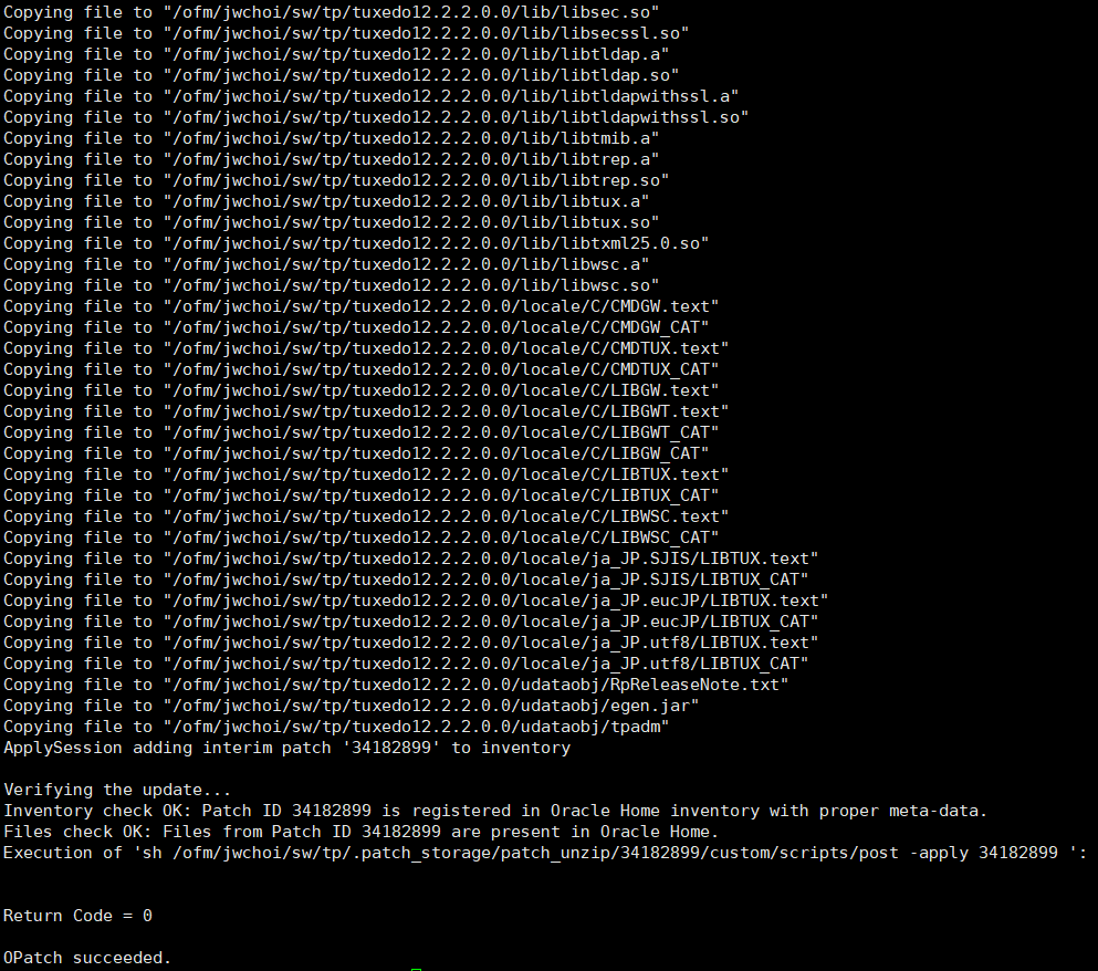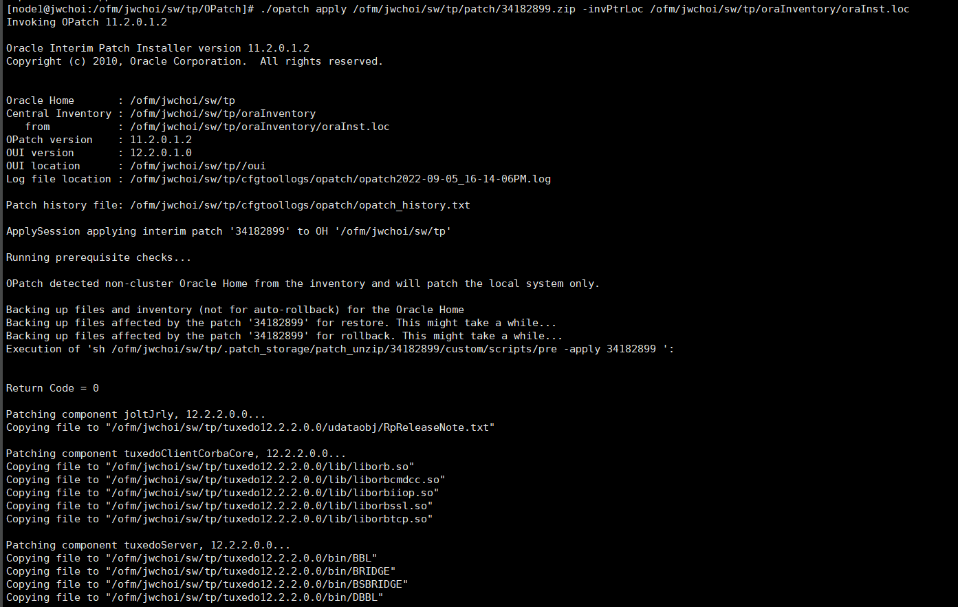 ./opatch apply /ofm/jwchoi/sw/tp/patch/34182899.zip -invPtrLoc /ofm/jwchoi/sw/tp/oraInventory/oraInst.loc