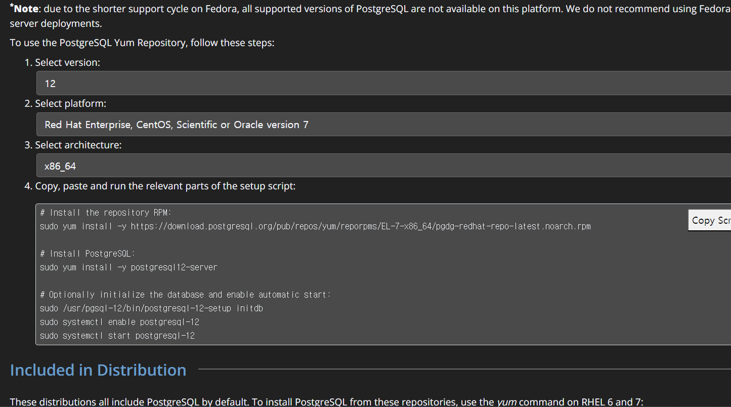 - 다운로드 : https://www.postgresql.org/download/linux/redhat/