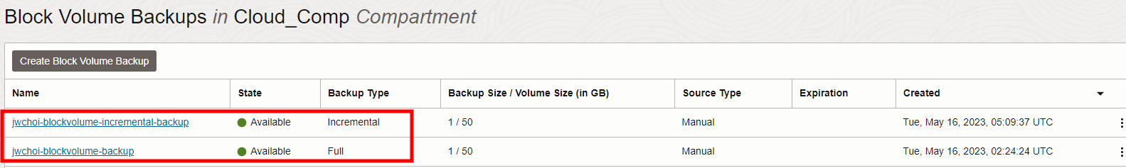 Backup Type으로 풀 백업과 증분 백업을 설정할 수 있습니다. Block Volume과 동일.