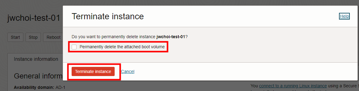 permanently delete the attached boot volume 체크박스를 해제해야한다.