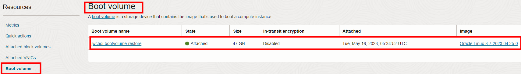 1) 컴퓨트 인스턴스에 attached된 Boot Volume을 클릭하여 상세 페이지로 이동