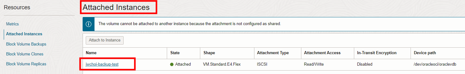 [opc@jwchoi-backup-test bin]$ sudo iscsiadm -m node -T iqn.2015-12.com.oracleiaas:7f034569-c78c-4b21-98f8-cc39013acd71 -p 169.254.2.2:3260 -l