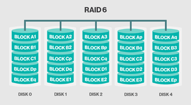 - 두 개의 디스크에 장애가 발생하더라도 두 개의 패리티 정보를 사용하기 때문에 두 디스크까지 복구 가능