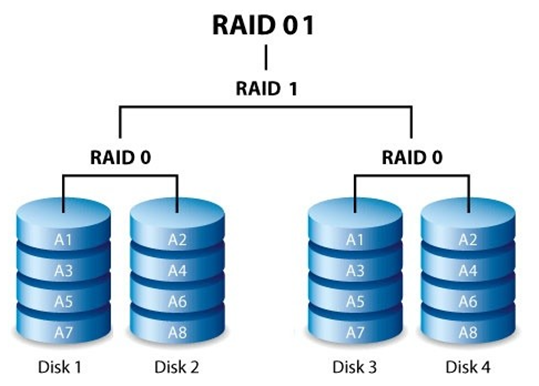 - RAID 0 방식으로 데이터를 저장하고, RAID 1 방식으로 디스크를 복제