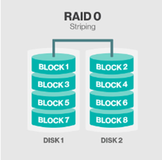 - 최소 2개의 디스크가 필요하며 RAID를 구성하는 모든 디스크에 데이터를 나누어 분할하여 저장한다.