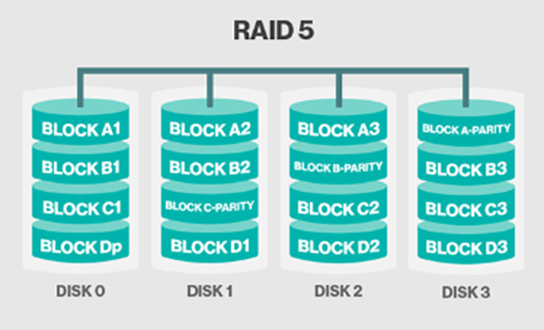 - 최소 3개 이상의 디스크로 구성하며 데이터가 Block 단위로 저장되고 별도의 전용 디스크에 Parity 정보를 저장하는 것이 아닌