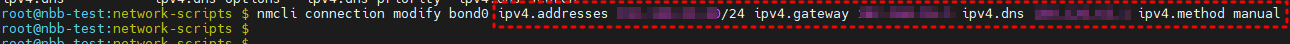 $ mncli connection modify [bond interface] ipv4.addresses [address] ipv4.gateway [address] ipv4.dns [address] ipv4.method manual